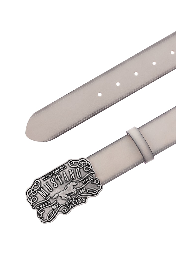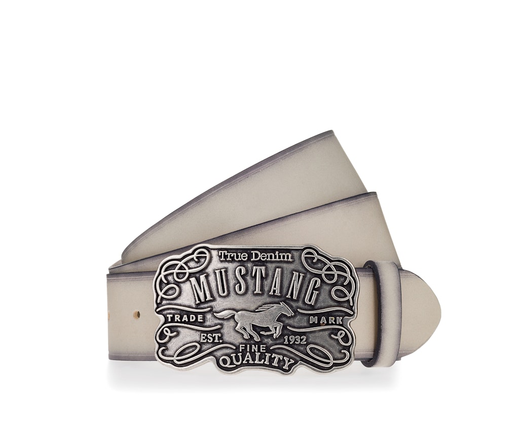 .Mustang MG2094L15-710 grey men's belt is an option for men who appreciate high quality and distinctive style. Made entirely of natural leather, it ensures durability and comfortable use for years. The 4 cm width makes it a perfect match for jeans, chinos or shorts, making it a practical and stylish everyday accessory. The biggest decoration of this model is a solid buckle with a striking embossed graphic depicting the Mustang logo and lettering emphasizing the character of the brand. Thanks to this, the belt not only fulfills its utilitarian function, but also becomes a strong styling accent. The ashen color of the leather gives the whole thing a versatile look, which goes well with both light and dark pants. This belt will work well for casual, everyday outfits, as well as for more refined styling, when you want to add character to your outfit. It's an accessory that combines classic craftsmanship with modern design and will be a must-have in anyone's wardrobe